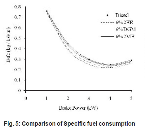 Fig. 5 indicates the comparison of Specific fuel consumption with respect to brake power for diesel and oxygenated blends with diesel at a constant speed of 1500 rpm. The specific fuel consumption is found to be reduced for all the three oxygenated fuels. Due to better combustion of the fuel the specific fuel consumption have moderate improvement. From the experimental results it was observed that 2EE blend is more effective in reducing the fuel consumption than other two oxygenates and diesel fuel. The Specific fuel consumption at full load is 0.29 kg/kWh (diesel), 0.26 kg/kWh (2EE Blend), 0.27 kg/kWh (DGM Blend), and 0.28 kg/kWh (2ME Blend) respectively. Minimum brake specific fuel consumption (0.22 kg/ kWh) was obtained at a brake power of 4 kW for 2EE blend with diesel fuel.
