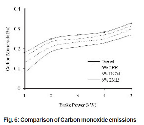 Carbon monoxide (CO) emissions are greatly dependant on the air fuel ratio relative to stoichiometric proportions. The comparison of CO emissions with different brake power output for diesel and oxygenated blends with diesel is shown in Fig.6. Addition of all the three oxygenated blends with diesel reduces carbon monoxide emissions from zero load to full load compared to diesel fuel. Reductions in the carbon monoxide emissions is due to improved combustion process since the oxygen content in the oxygenated blends with diesel fuel causes better combustion. 2ME blend with diesel reduces carbon monoxide emissions considerably compared to other blends with diesel fuel. The CO emission is approximately 20% less in case of 2ME blend compared to diesel fuel due to the presence of oxygen in the fuel leads to better combustion.