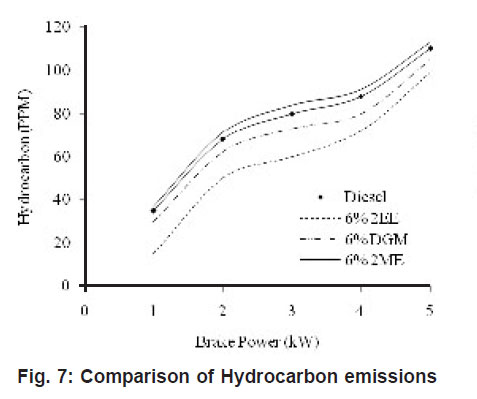 Unburnt hydrocarbon emissions consist of fuel that is incompletely burnt. The unburnt hydrocarbon emissions of three oxygenated blends are compared with diesel is shown in Fig. 7. Addition of DGM and 2EE blends with diesel reduces HC content in the exhaust compared to diesel. HC emission reductions may be attributed to better combustion. 2ME blend with diesel increases HC emissions. At full load, 2ME blend emits 113 PPM of HC emissions compared to 110 PPM of diesel fuel. Fine fuel spray which reduces momentum of droplets resulting in less complete combustion causes increase in HC emissions with 2ME blend with diesel fuel. 2EE blend with diesel shows better improvement in reducing HC emissions compared to other two blend proportions with diesel.