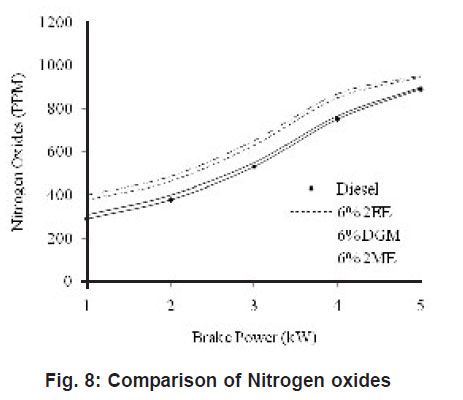 NOx emission increases with the addition of DGM and 2EE blends with diesel fuel. Marginal increase in NOx was observed with 2ME blend.