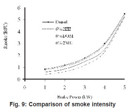 It is observed that addition of oxygenated compounds reduces the smoke intensity at all loads.