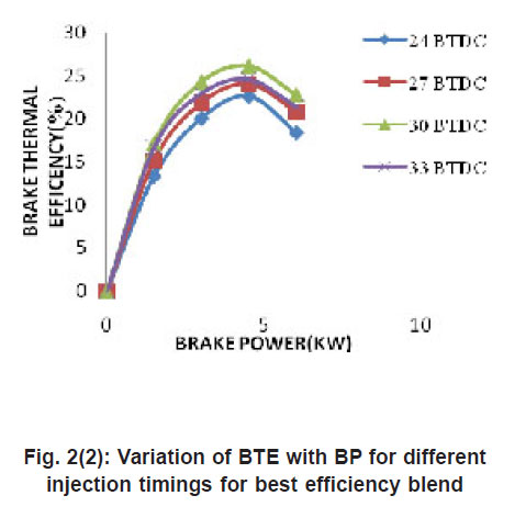 Figure 2(2): Variation of BTE with BP for different injection timings for best efficiency blend
