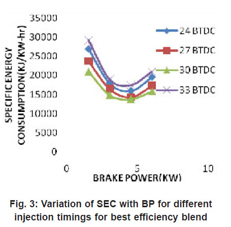 Comparison of the specific energy consumption for the four different injection timings for best efficiency blend (N20) is shown in fig no.3. It can be seen that the SEC is the highest in the case of the 33°BTDC and is least in the case of 30°BTDC. This is because at 30°BTDC the fuel is optimally injected such that proper diffusion of the biodiesel takes place. At 33° BTDC more amount of fuel is injected into the combustion chamber because of the advance in the timing which leads to excess consumption of biodiesel. At 27° BTDC and 24° BTDC there is not enough fuel for the diffusion to takes place which results in poor diffusion and as a result the amount of fuel required to produce one kW of power is higher.