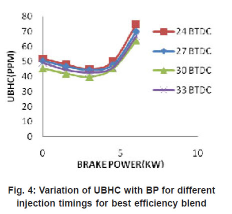 Figure 4: Variation of UBHC with BP for different injection timings for best efficiency blend