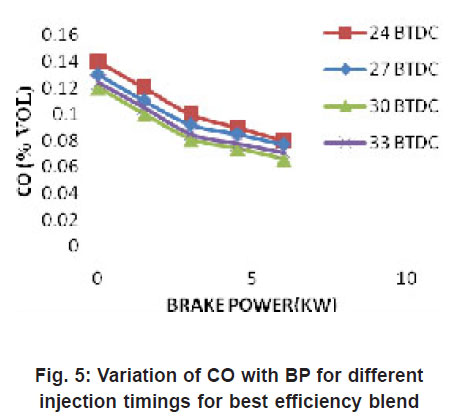 Figure 5: Variation of CO with BP for different injection timings for best efficiency blend
