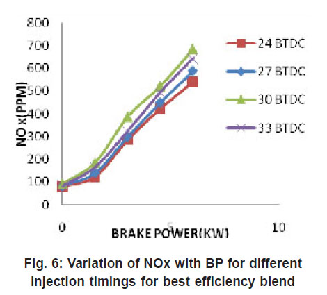 Figure 6: Variation of NOx with BP for different injection timings for best efficiency blend