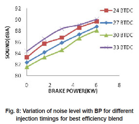 Comparison of the sound characteristics for the four different injection timings for best efficiency blend (N20) is shown in fig no.8. It can be seen that the sound characteristics is the highest in the case of the 33° BTDC and is least in the case of 30° BTDC. This is because at 30° BTDC the proper combustion takes places and due to this the power developed helps in smooth running which results in lower noise level. At 24° BTDC and 27° BTDC due to improper combustion the noise level is marginally greater. At 33° BTDC due to higher amount of fuel accumulation in the combustion chamber initially, the engine tends to knock and this leads to increase in noise level.