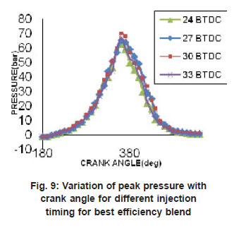 Figure 9: Variation of peak pressure with crank angle for different injection timing for best efficiency blend