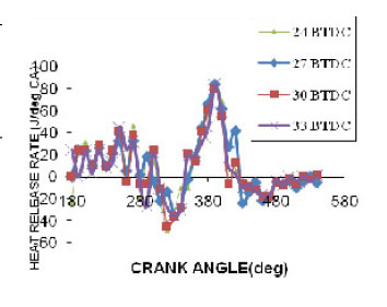Fig.10.Instantaneous heat release rate with crank angle for different injection timing for best efficiency blend. This is because at 30° BTDC, the increase in thermal efficiency indicates the complete burning of fuel and lower release of the heat to the exhaust and this reduces the instantaneous heat release rate. At 33° BTDC because of poor combustion the heat release rate is marginally higher. At 27° BTDC and 24° BTDC because of poor diffusion which causes the hot exhaust gases to escape out at a higher rate.