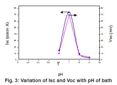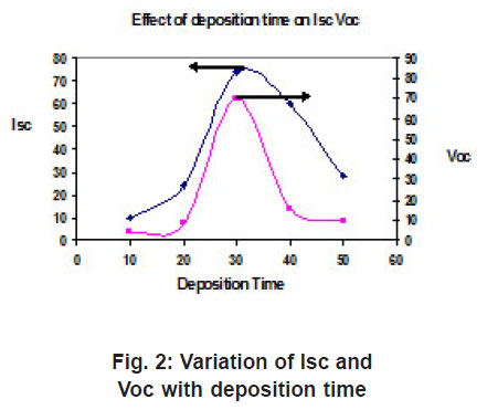 It can be seen that the Isc and Voc are relatively higher at deposition time 30 min. at pH 2 this may be due to formation of nearly stoichiometric ZnIn2Se4 thin film material at 30 min.and optimum thickness of ZnIn2Se4 for the effective absorption of the photons. Fig 2 shows the variation of Isc and Voc with deposition time and the optimum values of Isc and Voc are found to be for the film deposited for 30 min. this may be attributed to the optimum thickness of the film.