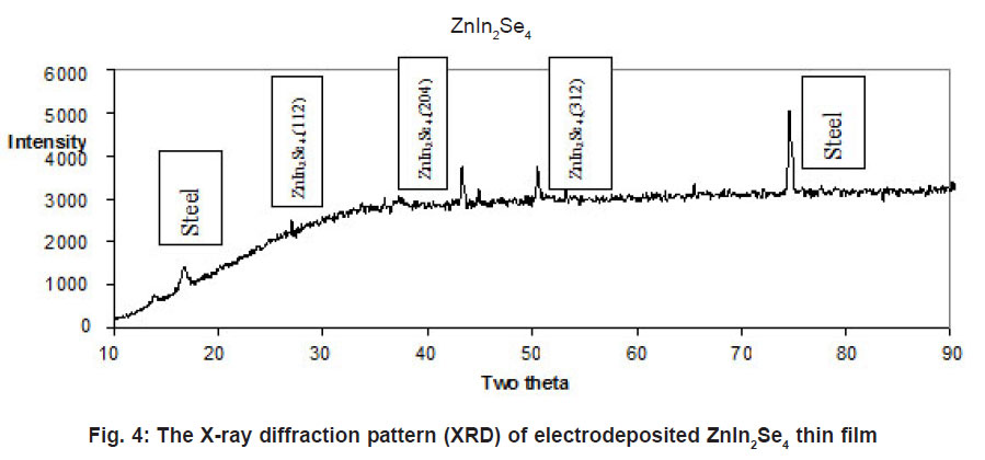 Fig 3 Shows that variation of Isc and Voc with different pH at constant deposition time. It can be seen that the Isc and Voc are relatively higher at pH =1 at deposition time 30 min and optimum pH of ZnIn2Se4 film for the effective absorption of photons. The grown ZnIn2Se4 film deposited at the optimized preparation parameter was further characterized by analyzing the X-ray diffraction (XRD) pattern. The XRD pattern of ZnIn2Se4 film deposited on stainless steel substrate is shown in fig.4.