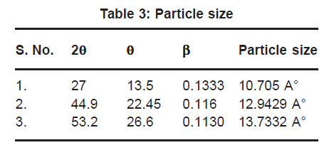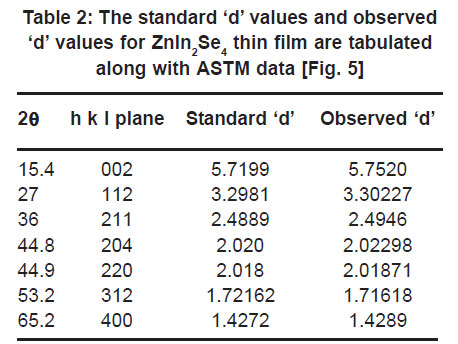 Table 2: The standard ‘d’ values and observed ‘d’ values for ZnIn2Se4 thin film are tabulated along with ASTM data [Fig. 5]