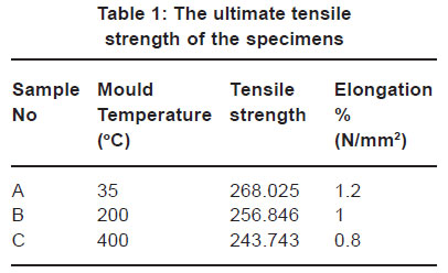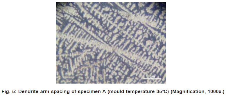 The ultimate strength of casting specimen (UTS) increases as rate of cooling increases, showing an inverse relationship with the SDAS.9,10 The increased in the strength of the cast product is due to higher cooling rate leading to grain refinement. The grain refining produces a large number of grains and hence increases in the amount of grain boundaries. The greater grain boundary surface area more effectively block or movement of dislocation and the strength of the casting product is increased6