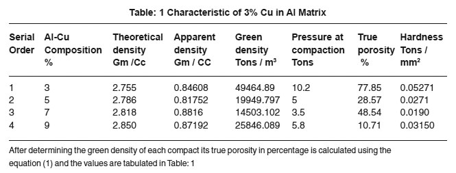 Nearly 15 compacts are prepared for the test. The green compact obtained is weighed using a common balance. Length and diameter of the green compact is measured with a micrometer. Green density3 is calculated using the equation G=4W / (II d 2g Ig) and it is tabulated. The parameters like apparent density, theoretical density, true porosity and hardness are calculated and recorded calculated using the equation (1) and the values are tabulated in Table 1.