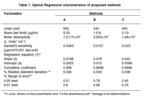 The developed methods are based on the formation of colored species by treating with Folin-Ciocalteau reagent (Redox reaction),8 3-methyl 2-benzathiazolinone hydrazone in the presence of Ferric chloride (Oxidative coupling)9 or 1, 10 Phenanthroline in presence of Ferric chloride (Oxidation followed by complexation).10