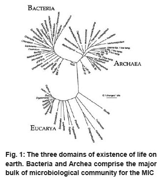 Figure 1: The three domains of existence of life on earth. Bacteria and Archea comprise the major bulk of microbiological community for the MIC