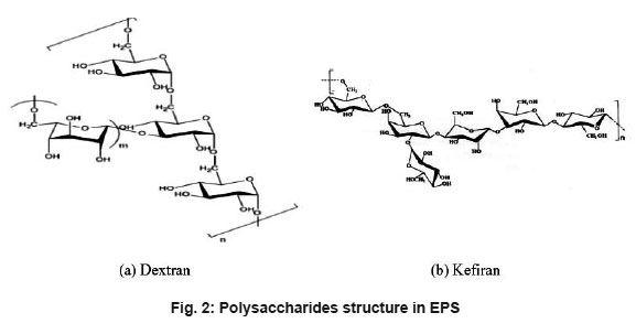 Depending upon the environmental conditions and microbial flora present, EPS can vary significantly from a homogenous to a more heterogeneous composition of the extracellular polymers. Proteins (glycoproteins), carbohydrates and humic acid substances are the main organic fractions of the EPS10. 40-95 % of the components of the macromolecules in the microbial EPS are accounted for the exopolysaccharides.11 The high molecular weight homopolysacchride, dextran is produced by the gram-positive bacteria Firmicutes. Firmicutes produces another type of polysaccharides, known as kefiran. The structures of dextran and kefiran have been shown in Fig. 2.14