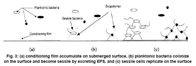 Figure 3: (a) conditioning film accumulate on submerged surface, (b) planktonic bacteria colonize on the surface and become sessile by excreting EPS, and (c) sessile cells replicate on the surface