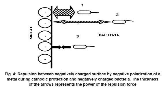 On applying a negative potential on a metal during cathodic protection, the surface becomes more negatively charged and repels the negative charged bacteria as shown in Figure 4. These repulsions prevent the bacteria from attaching to the surface until the distance is in a nano range. At the same time, the cathodic reaction happening over the metal, effects the hydroxyl ion release, thereby increasing the pH, which will subsequently make the environment more alkaline and slow down bacterial proliferation.21