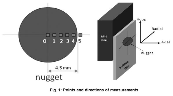 Residual stress measurements were taken from the center toward the edge of the nugget with radial distances of 1 mm respectively. Because of nugget symmetry, the measurement points have been represented residual stress distribution throughout nugget. Fig. 1 showed points and the schematic of three-axis measurement. The interface was defined as a boundary area between the two joined materials as shown in Fig. 2.