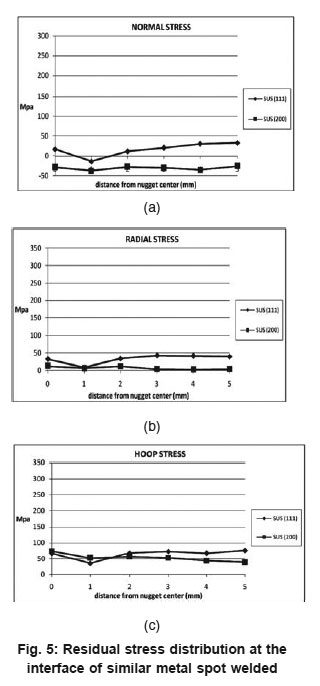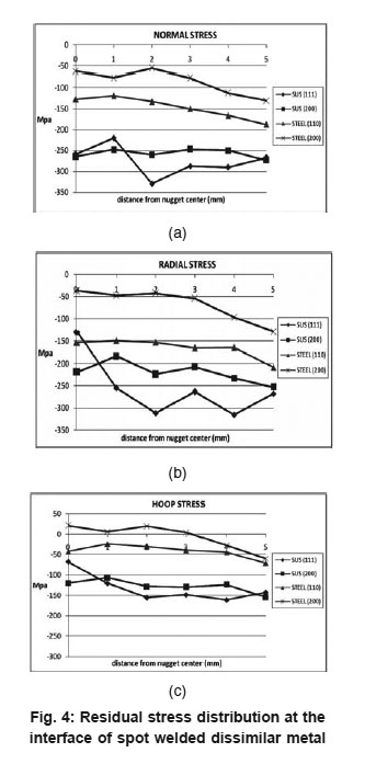 Fig. 4 and Fig. 5 compare the stress distributions measured at the interface of spot welded dissimilar and similar metals. The curves were created in the same scale to make clear comparison. The stress distributions at the interface of spot welded had the same pattern for all diffraction planes. However, the values of residual stress in different diffraction planes deviated by up to 100 MPa in dissimilar metals and 60 MPa in similar metals.
