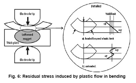 The differences of residual stress at the interface of spot welded similar and dissimilar metals, both value and pattern, were influenced by stresses worked at the interface during spot welding. The magnitude of these stresses was determined by physical, electrical, metallurgical and geometrical properties. The geometry which two plates with different thickness were joined, would cause a aberration of heat balance. Heat balance was defined as the conditions of welding in which the fusion zone of the pieces to be joined are subjected to equal heat and pressure.13 There might be a greater amount of localized heating in the thick plate than in the thin plat because the thick plate had the higher electrical resistance. Consequently, the asymmetry nugget was formed which the thick plat would have the wider part of nugget (Fig. 2). Another consequence of this condition was the bending load on the thin plate caused by electrode tip pressure. Fig. 6 illustrated the stress worked during the welding process. Stress at the interface of thin plat was tensile while in interface of thick plat was compressive. These stresses exceeded the yield limit and induced plastic deformation, because the yield limit dropped at welding temperature.14 After electrode pressure releasing and complete cooling, residual stress generated which was resultant of the bending stress in the thin plate and compressive stress in thick plate.