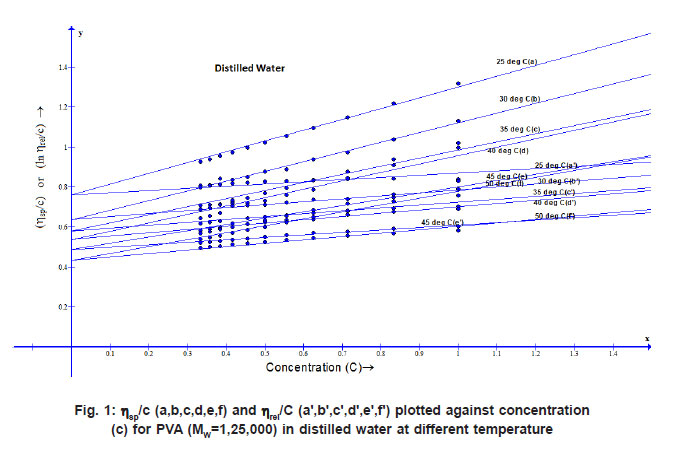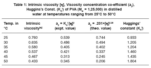 Table 1: Intrinsic viscosity [h], Viscosity concentration co-efficient (a2), Huggins’s Const. (KHl) of PVA (Mw = 1,25,000) in distilled water at temperatures ranging from 25°C to 50°C