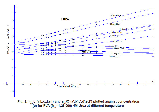 In aqueous solution of PVA (Mw =1,25,000), plots of hsp/C ~ C and (ln hrel/C ~C are straight lines (Fig. 1). In aqueous Urea both /C and (ln )/C versus C also show the ordinary rectilinear relations (fig.2). But the slope of (ln )/C versus C plot is negative in case of a aqueous Urea, where as it is positive in case of solvent distilled water.