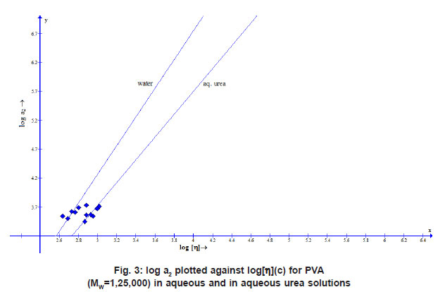 Figure 3: log a2 plotted against log[h](c) for PVA (MW=1,25,000) in aqueous and in aqueous urea solutions