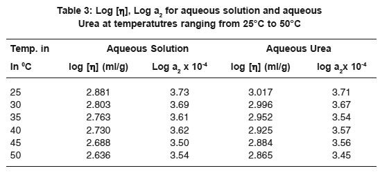 Table 3: Log [η], Log a2 for aqueous solution and aqueous Urea at temperatutres ranging from 25°C to 50°C