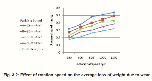 Figure 3.2 shows the effect of rotational speed on abrasion wear resistance of the joints. At lower rotational speed 400rpm, the abrasion wear resistance of the joints was higher. When the rotational speed was increased from 400 rpm, abrasion wear resistance was decreased and reaches a minimum at 1200 rpm this could be attributed to softening of material caused by higher heat input.