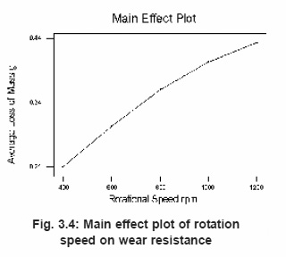 Figures 3.3 and 3.4 shows the main effect plot of welding speed and rotational speed respectively and indicates that the wear resistance increased with increasing welding speed and decreasing rotational speed. Also it can be concluded from table 3.1 that those two factors are the main effecting factors on wear resistance since they explain 99.64% variability in the model It’s clear from the table that welding speed has the largest sum of square 0.364128 so it can be inferred that welding speed has more significant effect on wear resistance followed by the rotational speed which is less significant.
