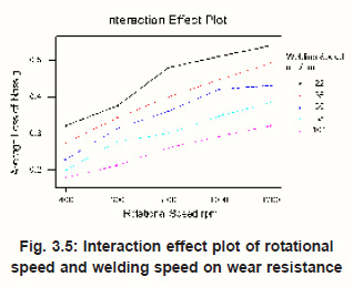 Figure 3.5 shows the interaction effect plot of rotational speed and welding speed on wear resistance, it can be concluded from the existence of parallels between the lines that the interaction effect of welding speed and rotational speed is not significant which support the result from table 3.1.