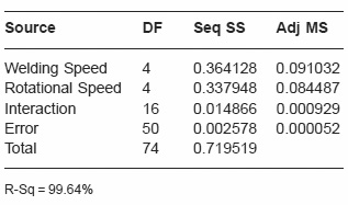 ANOVA indicates that welding speed is the dominant factor in the experiment, and interaction effect of rotational speed and welding speed is not significant.