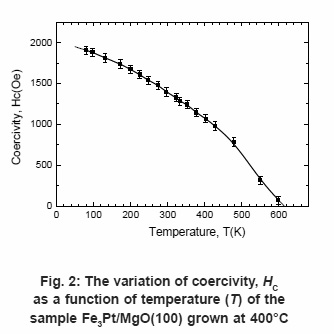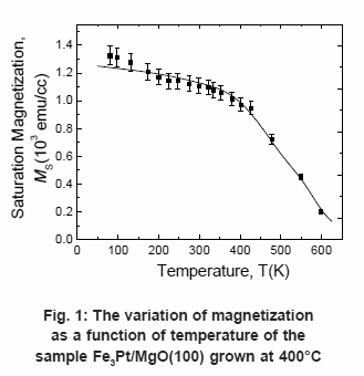 In our earlier paper, we demonstrated the close relationship of magnetic anisotropy constants of Fe3Pt thin films with the structural parameter [9, 12]. The Fe3Pt films grown at 400°C were partially ordered and exhibited maximum magnetic anisotropy at room temperature as reported earlier.9 In this paper, the temperature dependent magnetic properties such as saturation magnetization, coercivity, magnetic anisotropy constant etc. of Fe3Pt thin films were studied. Measurements were carried out in the range from 80K to 600K. Fig. 1 shows the temperature dependence of saturation magnetization (MS). At 80K, the saturation magnetization, MS was about 1300 emu/cc and diminished at about 625K. The coercivity (HC) of Fe3Pt alloy thin films as a function of temperature was depicted in fig. 2. The maximum coercivity was obtained at 80K of about 2 KOe. The magnetization and the coercivity fell in similar fashion with the temperature.