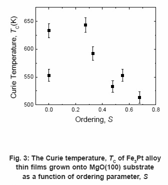 The Curie temperature was determined from the inflection point of M vs. 1/T plot. The Curie temperature, TC for the partially ordered (S=0.3) case was found about 625K (352°C). The result of TC as a function of the ordering parameter, S is shown in Fig. 3. The ordering parameter was estimated according to ref.9 It was observed that the Curie temperature decreased with the degree of ordering, although, there was a scatter in the data at S=0. The reason of this decrement of TC with the ordering was not clearly understood. However, the nearest neighbor occupancy probabilities and the change of atomic interactions from disordered to ordered state13 or the pair-ordering mechanism might be the origin of the change in Curie temperature. It is known that pair-ordering originates from the unbalanced distribution of the atoms.14, 15 In Fe3Pt alloy, three kinds of atomic pairs are possible such as Fe-Fe, Fe-Pt or Pt-Pt. As only Fe is magnetic, the interaction energy (dipolar and quadrapolar) is believed to depend mainly on the number of Fe-Fe pairs. The numbers of pairs depend on the order parameter that is controlled by growth temperature. The number of Fe-Fe planer pairs in Fe3Pt alloy is found to decrease with the ordering by simple calculations,12 which might be related with this decrement of the Curie temperature in the present case. The Curie temperature for the highest ordered sample (S=0.67) was obtained of about 513K (240°C), a little bit larger than that (435K, 162°C) for the bulk ordered Fe3Pt.
