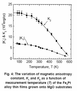The Fe3Pt thin films were fabricated by electron beam evaporation onto MgO(100) and MgO(111) substrates using Fe and Pt separate targets in a vacuum better than 10-7 Torr. The substrate deposition temperature (TS) was varied from ambient to 550°C. The combined deposition rate was 0.7Å/sec and thickness of the samples was about 50nm. The samples were rotated in order to get the better uniformity of thickness. Film stoichiometry was achieved by controlling the deposition rate of individual elements, Fe (γFe=0.47Å/ sec) and Pt (γPt =0.23Å/sec). All the films were analyzed by the Energy Dispersive X-ray diffraction and the film compositions were found within the range of ±1% from the stoichiometric composition. The in-plane magnetic anisotropy of Fe3Pt alloy thin films were measured by in-plane torque measurements. The entire samples were made circular in shape in order to avoid the shape magnetic anisotropy. The magnetic anisotropy constants, K1 of Fe3Pt films were obtained from the <001> oriented samples grown onto MgO(100) substrate while the magnetic anisotropy constants K2 were obtained from the <111> oriented samples grown onto MgO(111) substrate. The torque measurements were carried out in the temperature range (T) of 80K to 600K. The Curie temperature (TC) of the samples was determined from the temperature dependent magnetization curve.