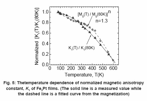 The temperature (T) dependence of K1 and K2 of Fe3Pt thin films grown at 400ºC were investigated over a range from 80K to 600K. The 4-fold and 6-fold symmetry torque curves were observed over the entire temperature range for the two-oriented samples grown on MgO substrates. However, a change in the torque amplitude was noticed with temperature. The magnetic anisotropy constants, K1 and K2 were found to decrease with the increasing T as shown in Fig. 4. When the measurement temperature approached towards the Curie temperature (measured value of Curie temperature of the Fe3Pt film was about 600K), both the magnetic anisotropy constants K1 and K2 gradually vanished similar to other ferromagnetic material. According to the previous theory, the power law dependence of magnetization can be expressed as,19-21 K1(T)/K1(0)=M(T)/M(0)n , where M(0) and M(T) are the magnetization at temperature 0K and T. We employed K1(T)/K1(80K)=M(T)/M(80K)n and numerically fitted our data. From the best fitted value as shown in fig.5, the exponent, n=1.3 was obtained. This value of n was smaller as predicted by Zener and Carr. According to those theories, the value of n would be 3 and 10 for uniaxial and cubic cases respectively. This kind of unexpected dependence of magnetic anisotropy was also observed in other materials22-24. Further theoretical framework is necessary to explain this behavior. However, from the nature of the slow decrement, one can say that the magnetic anisotropy energy of Fe3Pt films is more stable than other transition metal alloys in a wide range of temperature.