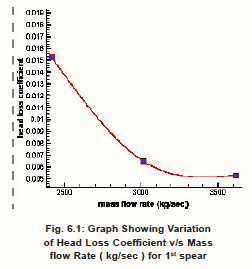 The outlet velocity and the head loss increases with the increase in mass flow rates for the same spear as seen in Tables 6.1. The head loss coefficient decreases gradually as mass flow rate for spear increasing from 3952.12 kg/sec to to 4940.15 kg/sec as seen in Fig.6.1