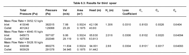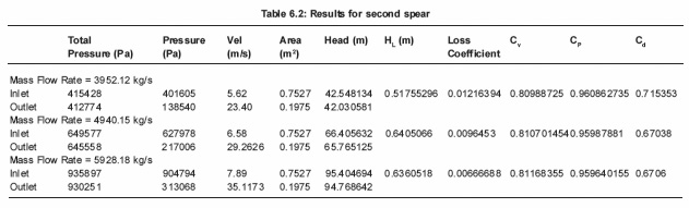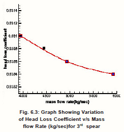 Head loss increases with the increase in mass flow rates for the spear as seen in Tables 6.3 and Head loss coefficient decrease when mass flow rate increasing from 3952.12 kg/sec to 5928.18 kg/sec from 0.0310 to 0.0304 respectively .