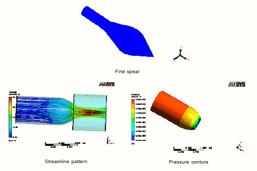 Pressure contours and velocity stream lines were obtained using insert contour and insert streamline commands of menu bar in ANSYS CFX-Post. Pressure contours and velocity stream lines for each geometry at different spear shape varying mass flow rate has been shown under.