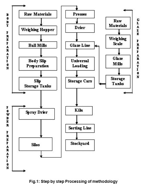 in this process 6 kg of each composition is prepared taking raw material in jar mill with 39 % water and 0.3 % sodium silicate as dispersant, ground till required residue level (4% on 150 mesh) is achieved. Density, viscosity and residue are checked. The slip thus prepared is dried in lab oven, dried, ground to granulated powder of 20 mesh size and maintained 6 % moisture. This powder is stored in polythene covers for 24 hours to achieve homogeneity in moisture. The aged granulated powder is pressed in a hydraulic press having 200 X 100 mm cavity at a specific pressure of 240 kg/ cm2. These tiles were dried in lab oven for three hours and passed on running production glaze line and applied glaze maintaining usual pickup weight of engobe and and glaze. These tiles were fired in regular production kiln at 1165 deg. 45 min. firing cycle. The samples of tiles thus fired were tested for various parameters in accordance with IS 15622.