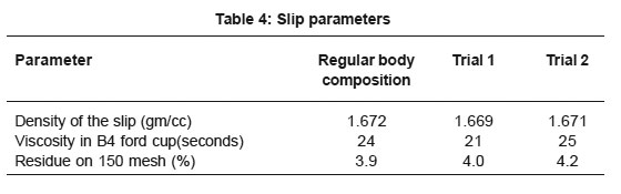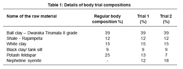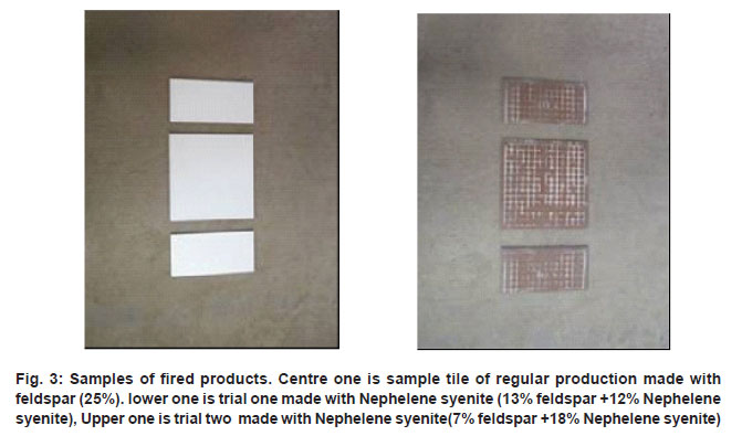 Marginal increase is observed in fired strength, fired shrinkage, decrease in water absorption in trial made with Nepheline syenite. Further slight positive warpage is observed in trial two and body colour of trial two is slightly darker than other two. Samples of trials made with Nepheline syenite also passes in crazing resistance, surface abrasion resistance, thermal shock resistance and chemical resistance and they are comparable with the results of regular body.