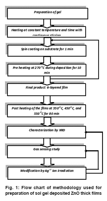 Zinc acetate dihydrate, iso-propanol, ethanol amine, analytical grade reagents (Sigma Aldrich) are used as the precursors for the sol preparation. Initially, zinc acetate dihydrate (3.10 gm) is dissolved in iso-propanol (15 ml). Ethanol amine (0.86 ml) is then added to the zinc acetate solution with ethanol amine to zinc acetate molar ratio 1:1. The mixture is continuously stirred at 600C for 60 minutes.40-43 The sol, thus obtained, is then aged for 24 hrs for gelation to occur. ZnO thick films are deposited on precleaned glass substrate by sol gel spin coating technique. Cleaned glass substrates are fixed on the spin coater and are spun at 2500 rpm for about 1 minute while aged gel is dropped onto a glass substrate. The obtained single layer film is then heat treated in air oven at 270OC for about 10 minutes for the decomposition of the precursor components & formation of metal-oxides. Thus, six layered film is deposited by spin coating, followed by baking at 270OC after deposition of each layer, resulting in a thick film. These six layered films are annealed at a temperature of 350OC and are used as sensors for further studies. Figure 1 gives flowchart of sol gel spin coating process of ZnO thick films.