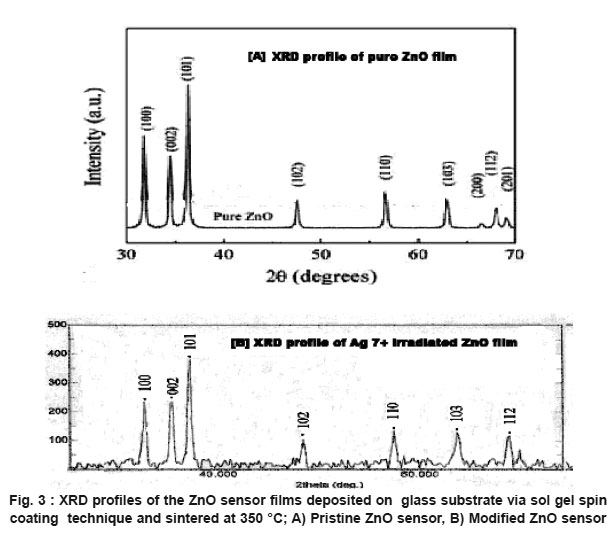 The pristine and irradiated sensors are subjected to XRD analysis. The crystalline phase of ZnO thin films is identified using Rigaku make X-ray powder diffractometer (Miniflex). The samples are irradiated with monochromatic CuKα radiation having a wavelength of 1.542 A0and the XRD patterns are recorded over a 2θ range of 300 to 700.