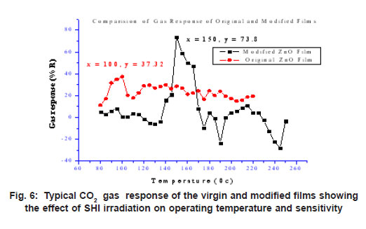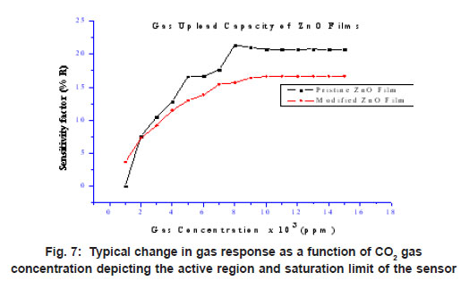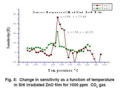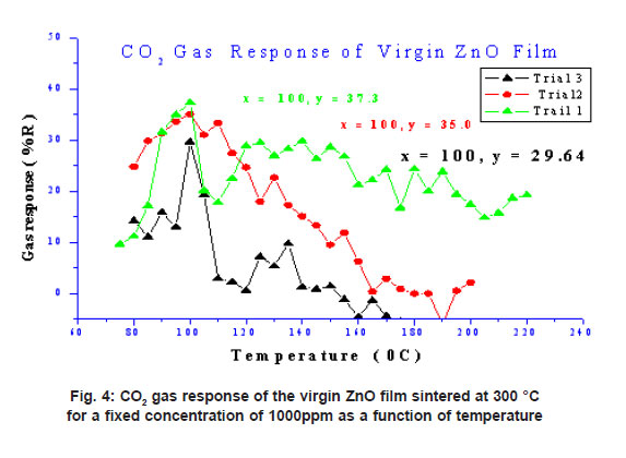 Thus, ZnO sensor works on the adsorption of oxygen on the available surface site and the reaction between adsorbed oxygen and the test gas (CO2) is the cause of change in resistance of the sensor material. The decrease in sensitivity factor (R) at higher temperature may be due to desorption of pre-adsorbed oxygen ions from the surface of the sensor.