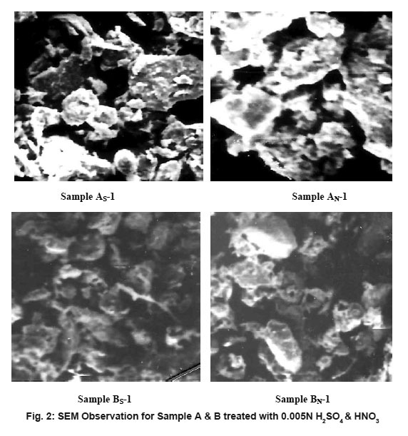 The soil samples were analyzed before and after acid treatment using scanning electro microscope (SEM) for finding the texture of the soil crystals. The SEM observation for the original samples A & B are presented in Fig. 1. The SEM observation for Sample A & B treated with 0.005N H2SO4 & HNO3 are presented in Fig. 2. It is observed that angularity of the particles is increased which can be attributed to leaching of the cations and subsequent deflocculation. The degree of variation increases as the strength of acid rain increases.