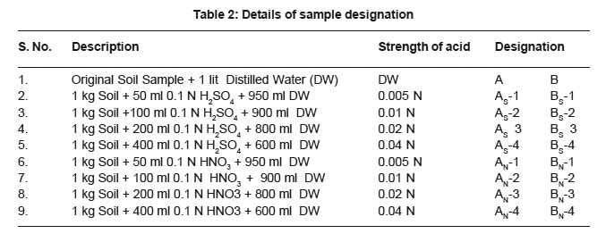 1 kg of each soil sample was separately shaken for 8 hours with 1 liter of H2SO4 and HNO3 of 0.005N, 0.01N, 0.02N and 0.04N strengths as detailed in table 2. These samples were then kept undisturbed over night. The treated samples were then filtered and air dried. These samples were then used to find their consistency, strength and chemical properties as per Bureau of Indian Standards.5-7