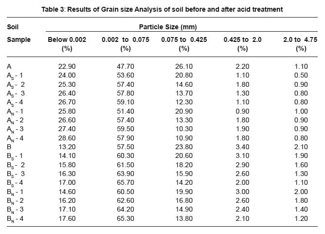Table 3: Results of Grain size Analysis of soil before and after acid treatment
