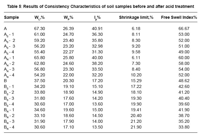 Table 5: Results of Consistency Characteristics of soil samples before and after acid treatment